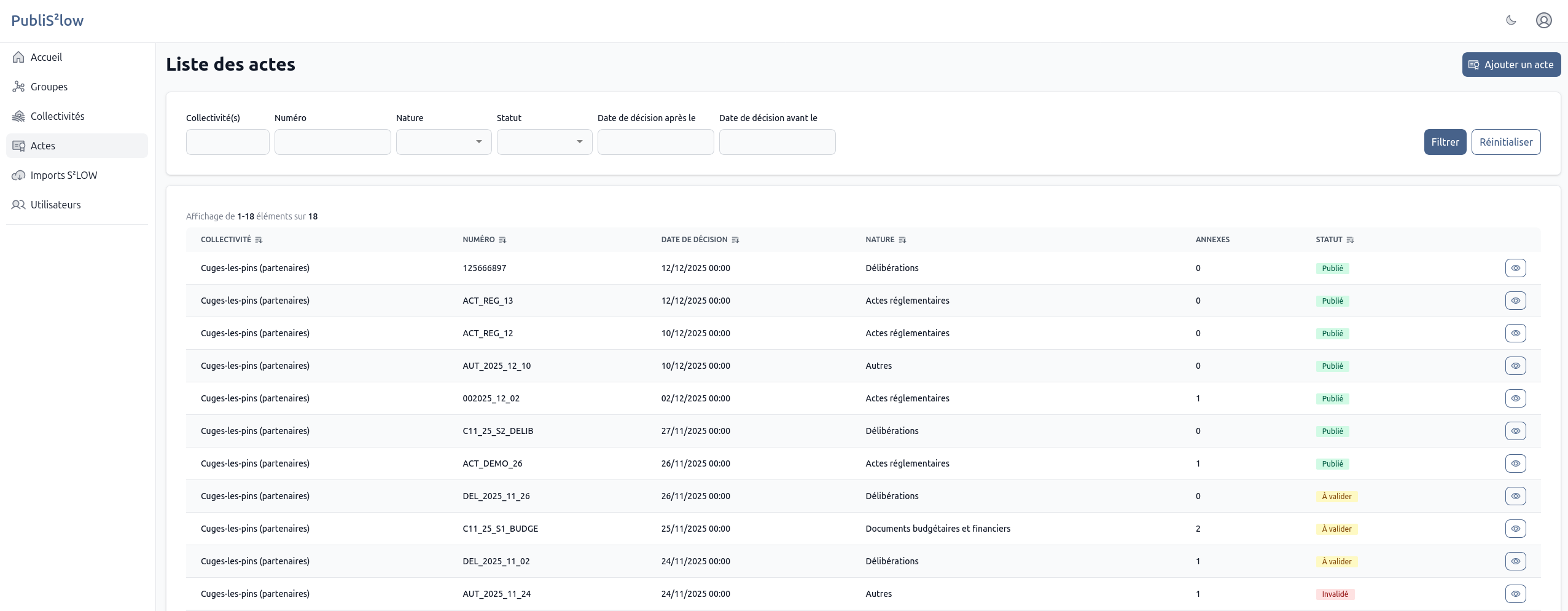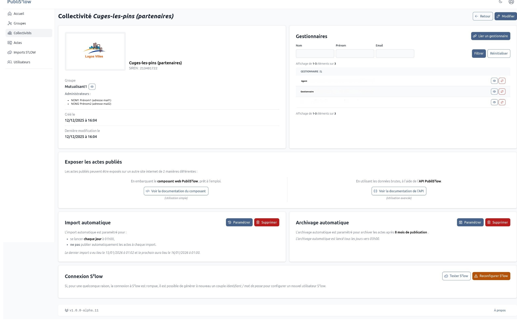 Pour accéder à cette solution, il est nécessaire que la collectivité soit utilisatrice du logiciel libre de télé-transmission des actes S²LOW. En effet, PubliS2low permet de publier grâce à une API, les actes réglementaires issues des documents télé-transmis par la collectivité via S²LOW.